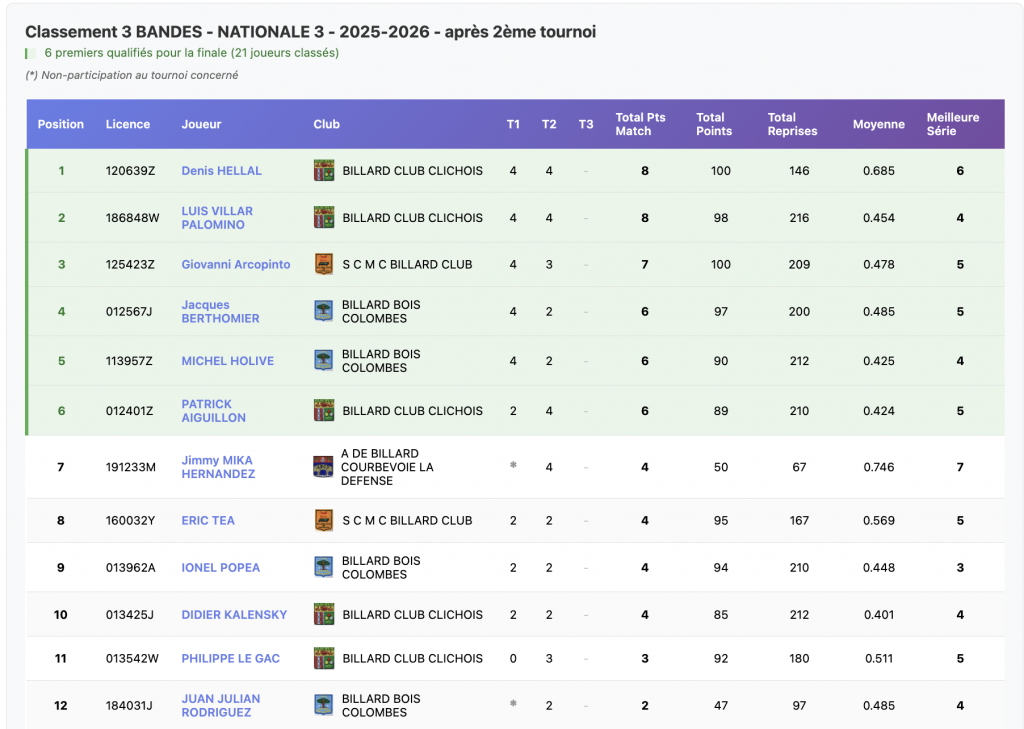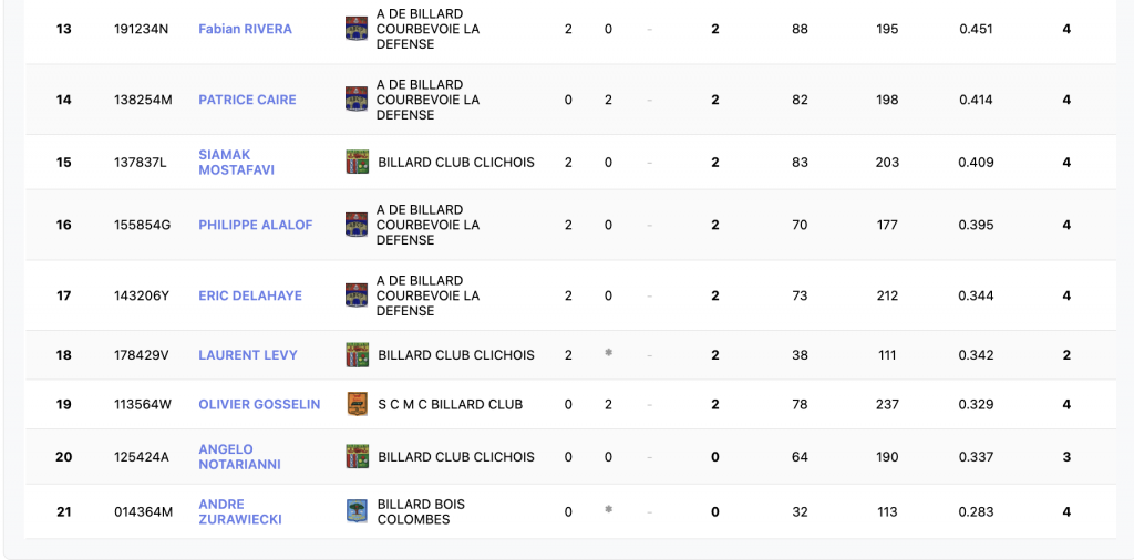 C’est Jimmy Mikan Hernandez de Courbevoie qui arrive à la première place, fort d’une belle moyenne, devant 3 joueurs de Clichy ayant aussi gagné leurs 2 matches du jour.