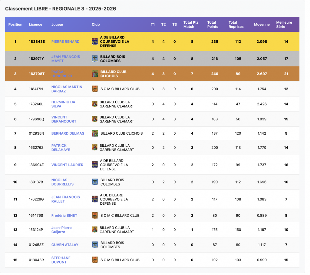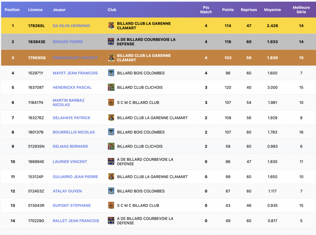 Herminio Da Silva de Clamart arrive en tête de ce tournoi avec 2 matches gagnés mais la meilleure moyenne du plateau.