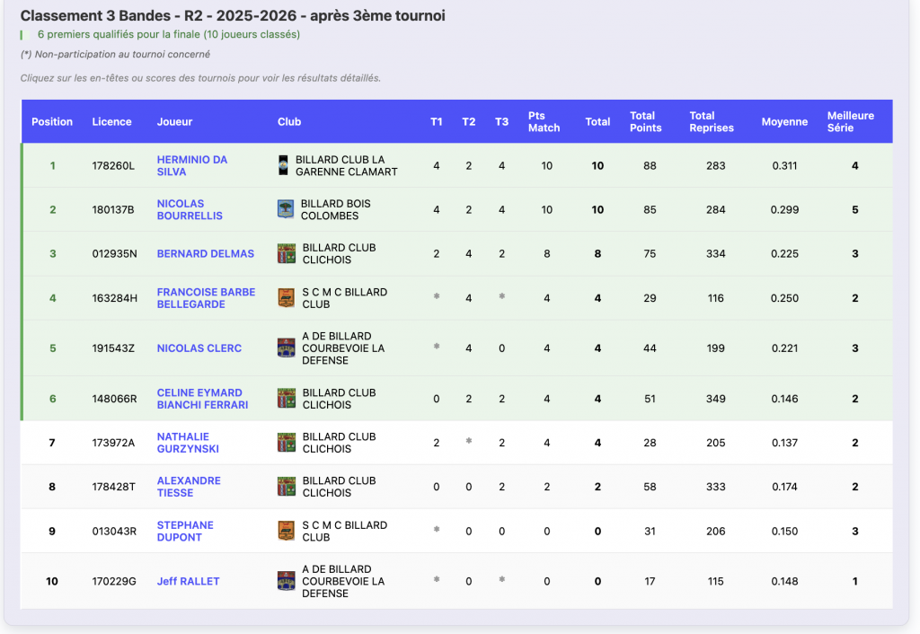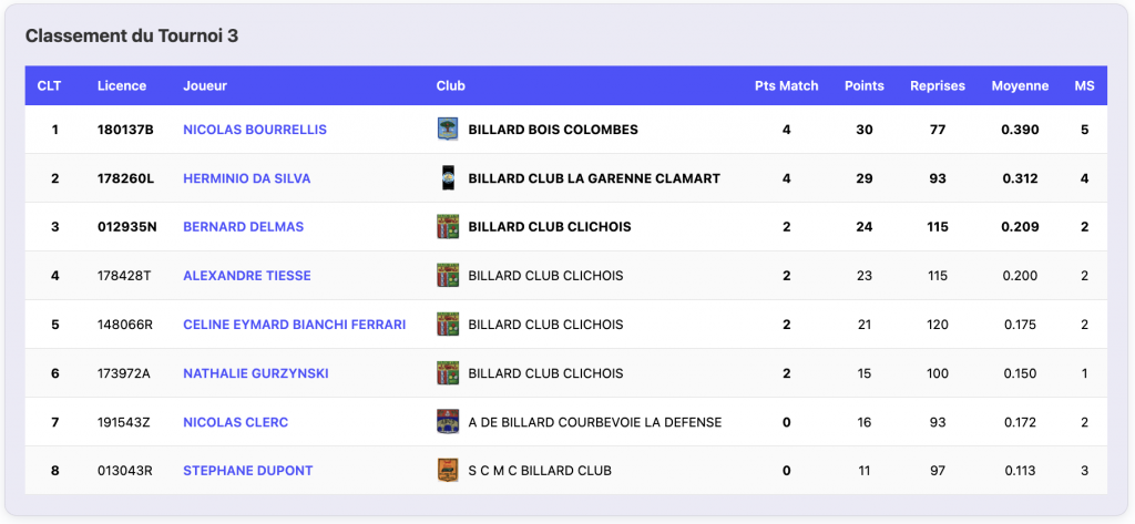 Ce samedi 14 mars 2026, 8 joueurs se sont affrontés au club de BILLARD BOIS COLOMBES pour le Tournoi 3 de 3 Bandes – R2.