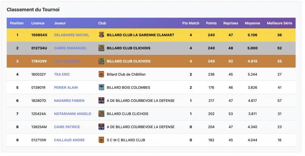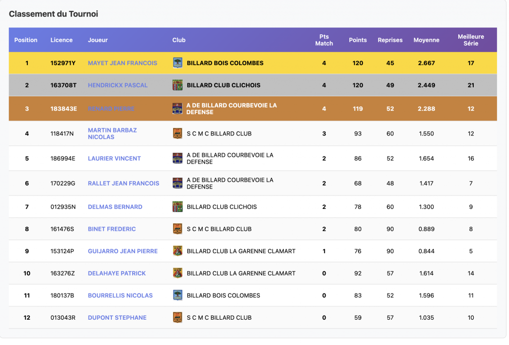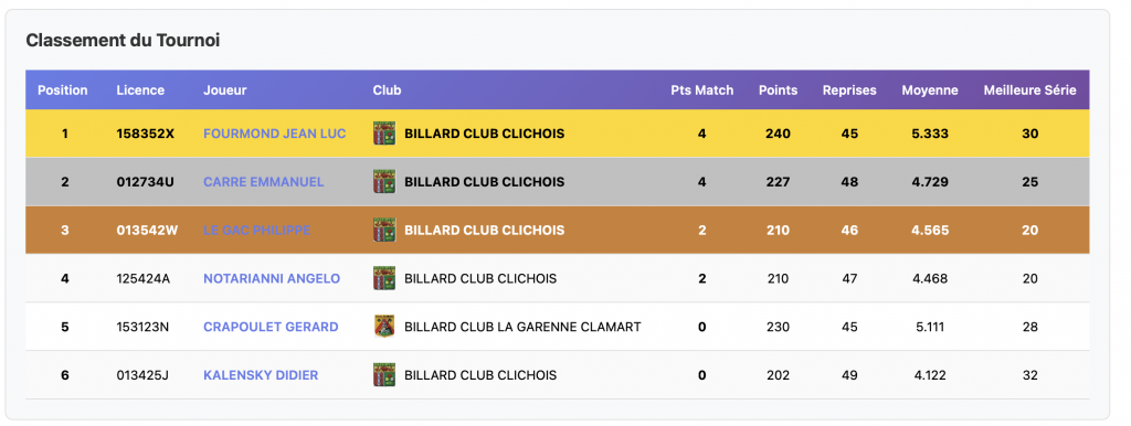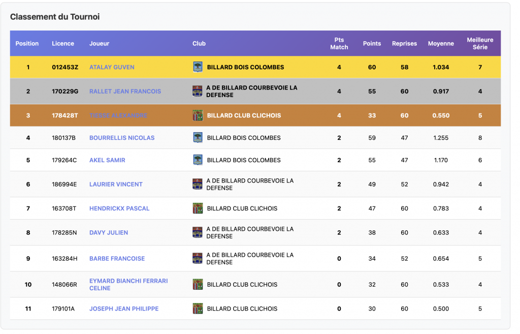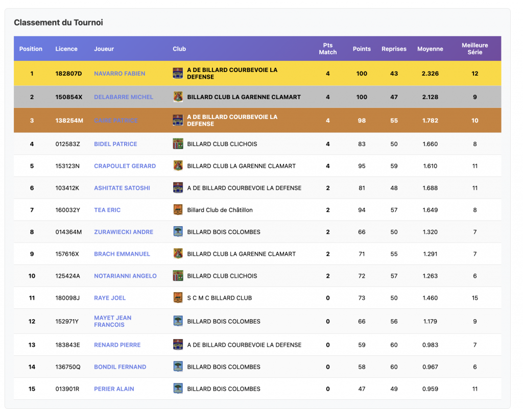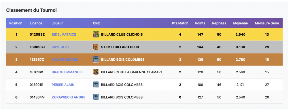 Réparties sur 2 sites, Clamart et Bois-Colombes, les rencontres du premier tournoi de la catégorie Bande R1, ont vu 15 joueurs s’affronter. Fabien Navarro, du club de Courbevoie grâce à la meilleure moyenne, arrive en tête. Michel Delabarre de Clamart et Patrice Caire de Courbevoie également, complètent le podium provisoire. Bravo tout de même aux 5 joueurs ayant gagné leurs 2 matches, ainsi qu’à tous les participants.