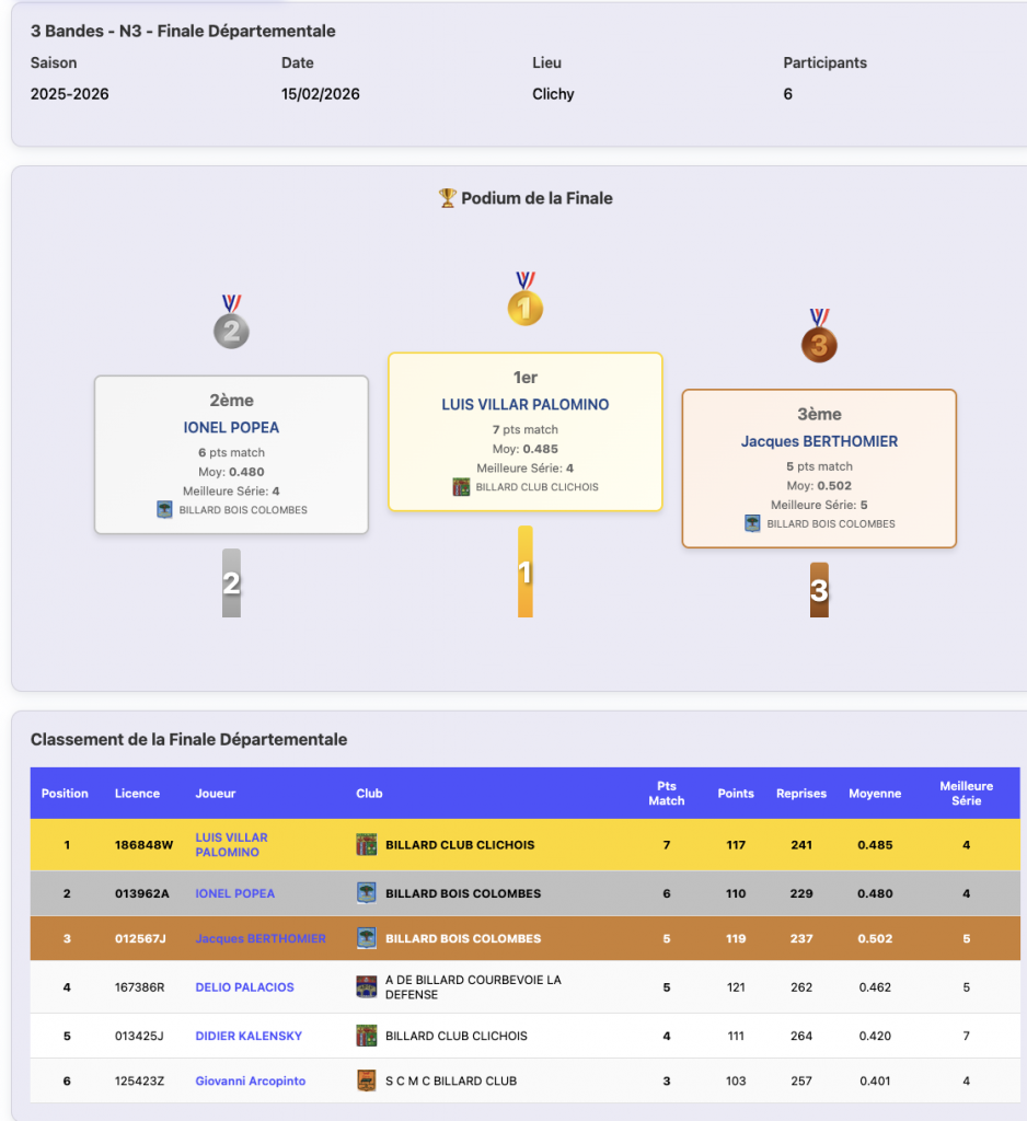 Ci-dessous le résultat final, envoyant Luis Villar Palomino du club de Clichy, en final de ligue.