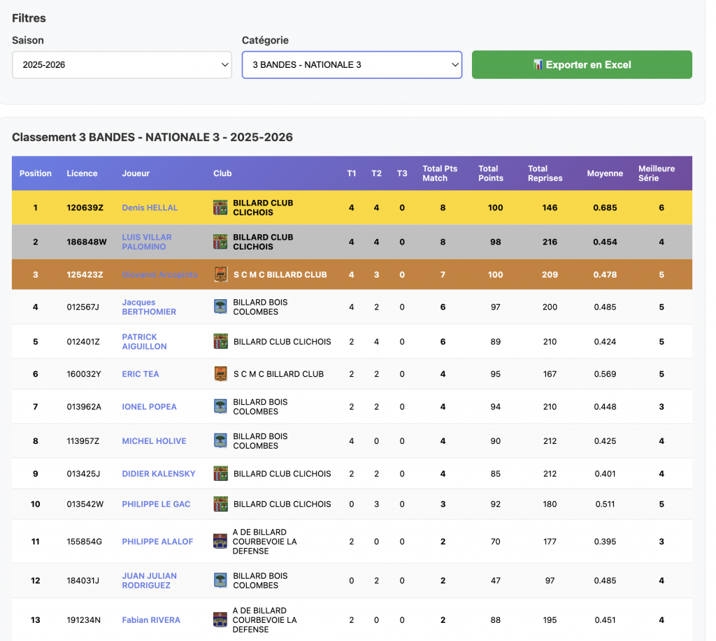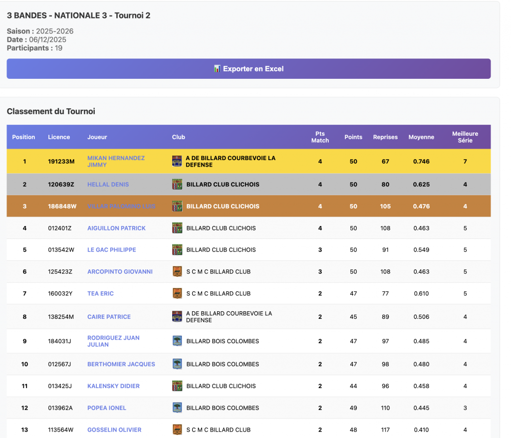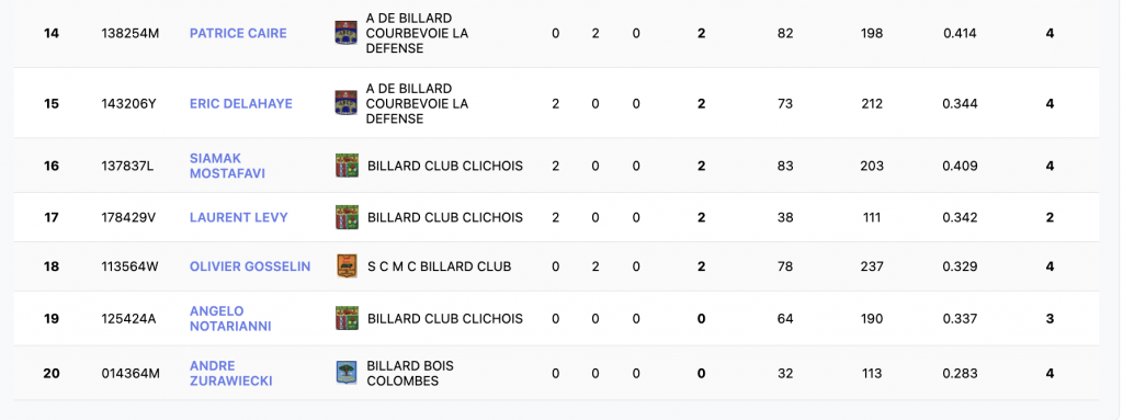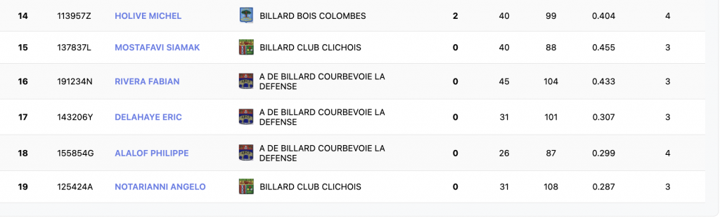 C’est Jimmy Mikan Hernandez de Courbevoie qui arrive à la première place, fort d’une belle moyenne, devant 3 joueurs de Clichy ayant aussi gagné leurs 2 matches du jour.