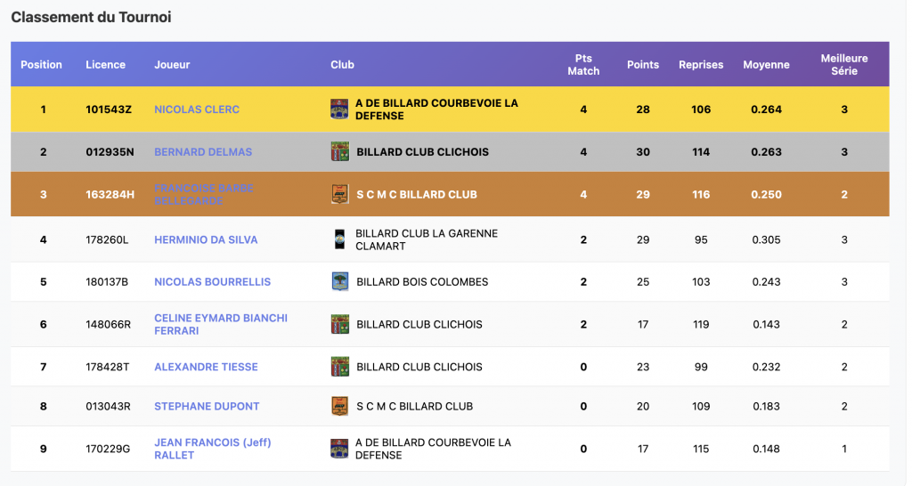 Finalement 3 poules de 3 joueurs ont disputé cette compétition qui a vu Nicolas Clerc, du club de Courbevoie, tout nouveau dans la pratique de ce sport et en particulier de ce mode de jeu, arriver en tête grâce à sa meilleur moyenne.