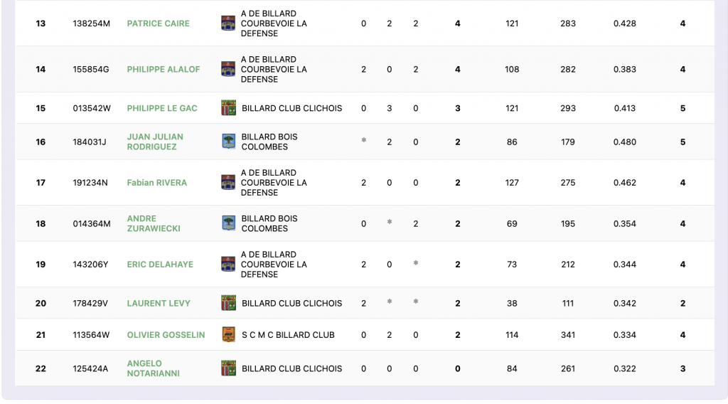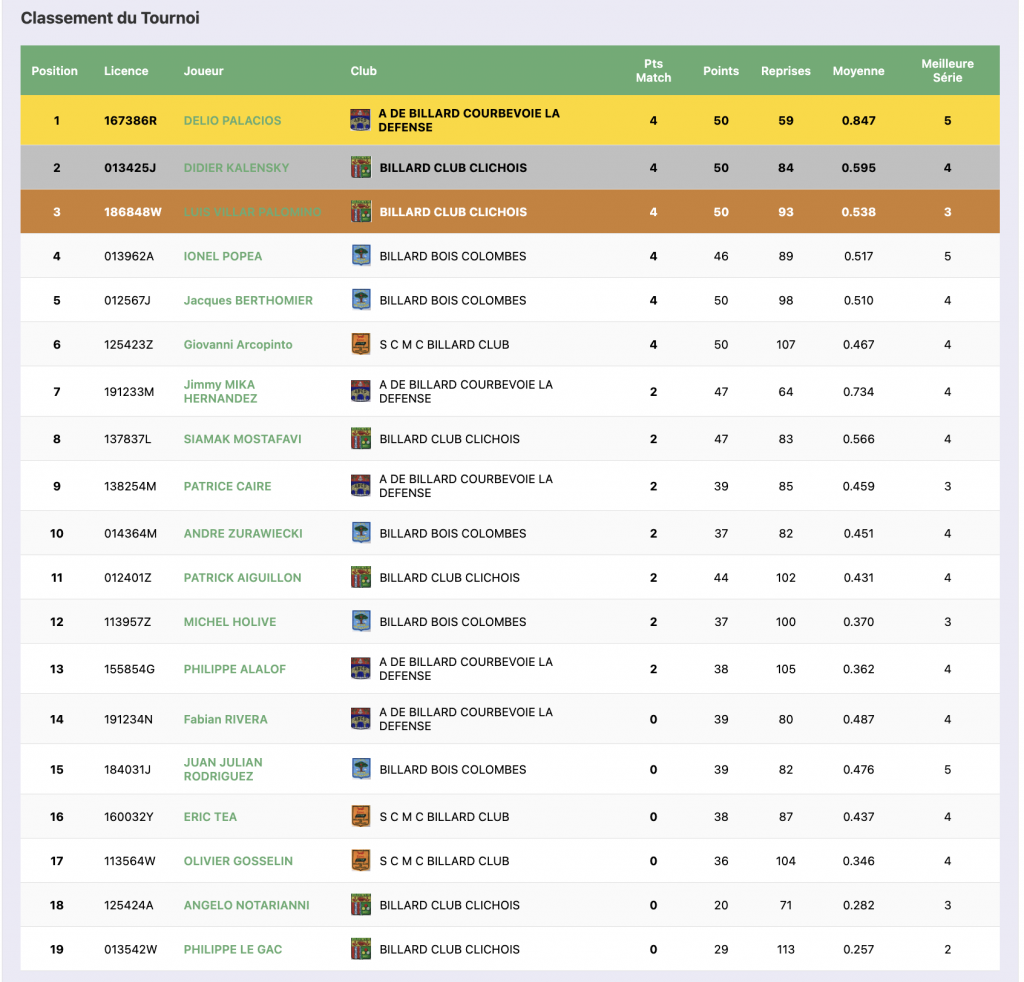 Sur 2 sites, Courbevoie et Bois-Colombes, s’est tenu le troisième tournoi qualificatif pour la finale départementale de la catégorie N3 du mode de jeu 3 bandes. Delio Palacios, de Courbevoie, l’emporte grâce à une excellente moyenne, devant Didier Kalensly et Luis Villar Palomino, également vainqueurs de leurs 2 matches.
