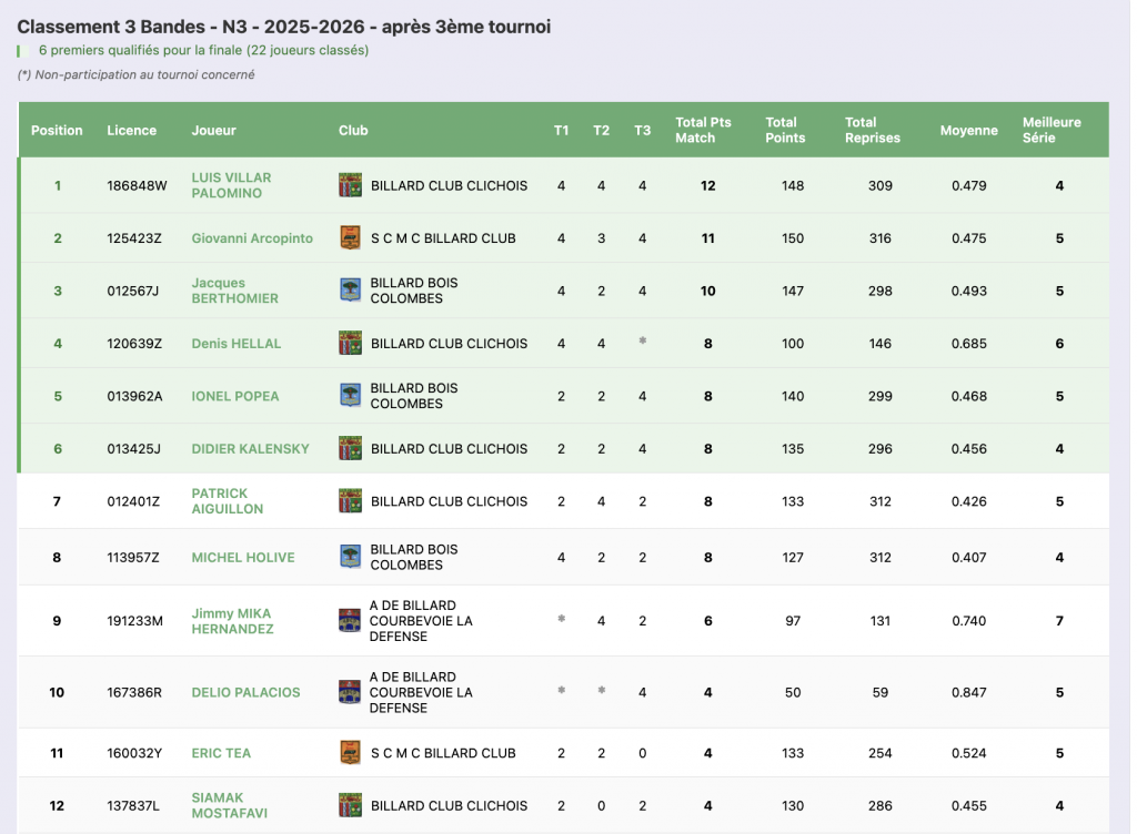 A l’issue de ce 3éme tournoi, le classement dans lequel paraissent 22 joueurs, s’établit comme suit. Les 6 premiers sont donc qualifiés pour la finale, dont l’invitation sera prochainement envoyée pour le 15 février prochain.